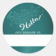 "Hello My Name is" name tag for a music event has a musical notes and treble clef design in teal and a space for party or event guests to write their names.