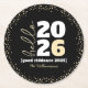 “Hello 2026. Good riddance 2025.” Sometimes, the new year can’t come quickly enough. And this is one of those years. A playful visual of modern, bold, white, graphic block typography and faux gold glitter elegant script calligraphy and dots over black, help you usher in the New Year. Feel the warmth and joy of the holiday season whenever you relax with your favourite beverage on this stylish and modern personalised name and year paper party coaster. Choose from various shapes. Matching and coordinating cards, envelopes, stickers, giftwrap, plates and other products are also available. Makes a fun and festive addition to your party!