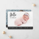 Simple and modern birth announcement card featuring a photo template with an overlay text in dark grey fonts that reads Hello, I'm Amelia (customisable with your baby's name). The dark grey band on the lower part is personalizable with the birth stats in white lettering.