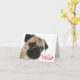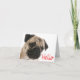 Send some Pug love to friends and family. This cute Hello note card features an image of a happy pug puppy dog with a handwritten red hello greeting highlighted against a crisp white background.
