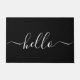 A stylish modern hello door mat with modern white script calligraphy typography on black.