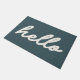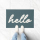 This stylish doormat features a modern minimalist design of the word Hello in script lettering on a dusty teal green background.