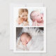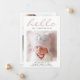 Modern and simple design frames your baby girl's photos to perfection. This vertical birth announcement card showcases a large square photo of your daughter on the front. It is a two-sided design that features three more newborn baby and family photographs on the back. Hello is written above the front picture in a large blush pink script with her name below in a soft dove grey. Birth stats are provide below the picture. There is also a line for you to add a personal welcome or description. All of the text is editable. This DIY template provides the flexibility to express yourself and describe your baby.