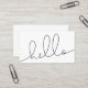 Minimal black and white business card featuring a text on the front that says "hello!" in casual hand lettered script. Professional and simple design.