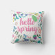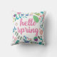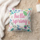 Hello spring pillow for spring decorating. Floral elements in spring colours surround a centre that reads HELLO SPRING in a fun script.