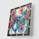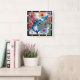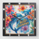 This vibrant square wall clock features two playful blue dolphins leaping amidst an explosion of colourful tropical flowers and cheerful paint splatters. The welcoming text "Hello Summer" perfectly captures a joyful, warm-weather vibe, making it a lively and artistic decorative timepiece for any room.