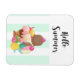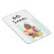 A flex magnet with the text: Hello Summer. illustrated with drawing of a 3 scoop ice cream sundae with colourful sprinkles. An ice cream cone with scoops of chocolate, strawberry and vanilla. A bowl of neopolitan ice cream with a cherry on top. Strawberries and a pineapple fruit sit beside the bowls.