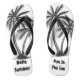 A pair of flip-flops featuring palm tree designs on a sandy beach, the text "Hello Summer" and "Fun in The Sun" in the background.