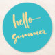 Hello Summer Yellow Blue Modern Script Round Paper Coaster
