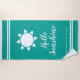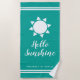 Hello Sunshine summer beach towel with custom name. Personalised beach towels with elegant brush script typography and stripes. Add your own funny quote, name or monogram letters. Cute Birthday gift idea for wife, girl, girlfriend, daughter, friend, aunt, grandma, sister, mum, wedding bride, bridesmaid, lady boss, retired person, couple etc. Fun summer accessories for beach and pool. Classy hand lettering design with customisable turquoise blue background colour. Luxury presents for her. Also great for just married honeymooners.