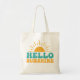 The tote bag design features the cheerful phrase "HELLO SUNSHINE" in a playful, retro-inspired font with bright and uplifting colours. The word "HELLO" is styled in bold teal blue, while "SUNSHINE" shines in warm, sunny yellow, creating a vibrant and eye-catching contrast. Above the text, a stylised sun graphic with radiant rays adds an extra touch of warmth and positivity. This tote bag is perfect for carrying your essentials while spreading happy vibes wherever you go.