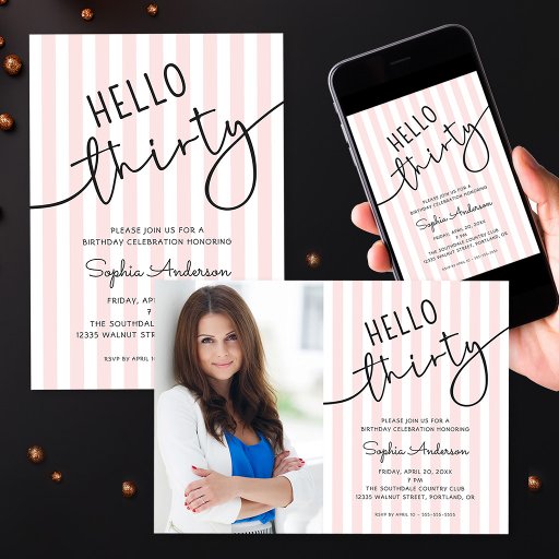 Hello Thirty Modern Script Chic Stripes BirthdayDesigned by Linda Terwee