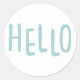Round sticker with “HELLO” typography greeting in light blue for your decorating, gift wrapping, sealing your envelopes.