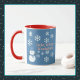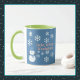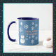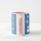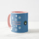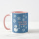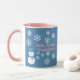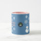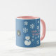 A Slice of Life and Delight presents Hello, Winter Wonderland combo coffee mugs with a snowman decorated with white snowflakes, pink writing, and a blue backdrop. The snowman coffee mugs also have a blue hat and scarf.