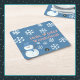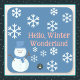 A Slice of Life and Delight presents Winter Wonderland paper coasters with a snowman decorated with white snowflakes, pink writing, and a blue backdrop. The snowman coasters also have a blue hat and scarf.