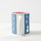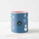 A Slice of Life and Delight presents Hello, Winter Wonderland Two-Tone coffee mugs featuring a snowman decorated with white snowflakes, pink writing, and a blue backdrop. The snowman mugs also feature a blue hat and scarf.