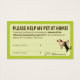 It’s certainly not something we wish for you, but have you ever thought “What would happen to my pets if I was in a terrible accident?” “What if I died and no one knows my pet is home alone, possibly days on end? Who’s going to feed and take care of them?” With this card, we hope you can avoid such a situation. Write the name and phone number of a trusted family member or friend (designated caretaker) and place this card in your wallet. The police or emergency personnel who will look through your wallet for identification will also find this card. They can call your designated caretaker so your pets can be cared for immediately. This card was inspired and created after the 3.11 Japanese Earthquake/Tsunami disaster, after which many pets starved to death after being left by their owners because they were told by the government that they could not take their pets when evacuating (understandably, many owners hesitated to leave them but they were told that they would be able to return home soon—which did not happen). We dedicate this card to all those animals who perished and people who lost their pets.