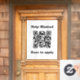 A line of display text is at the top. You can edit the text to show a custom message. (Shown: Help Wanted) A QR code is in the center. (Remember to enter your website URL for the QR code to work correctly.) Another line of display text is at the bottom. You can edit the text to show custom message (shown: Scan to apply).