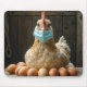 A hen wearing a blue face mask sits surrounded by a neatly arranged circle of brown eggs