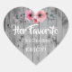Rustic, grey wood and pink floral wedding favour heart stickers- Background is old, grey rustic wood that resembles bleached out beach wood or old barnwood planks. Top is adorned with watercolor floral wreath in blush and coral pinks and green. Below reads 'Her Favourite'. Name of treat below in elegant letters and 'Enjoy!' printed at the bottom. Perfect wedding favour labels for rustic wedding decor, grey and pink wedding colours, floral garden weddings, barn weddings, casual outdoor weddings, etc. Click Customise option to change text colours, size, and font styles. We have matching 'His Favourite' stickers for the groom, as well as coordinating wedding invitations and other rustic wood wedding supplies in our Zazzle.com/angela65 shop.