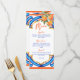 She found her Main Squeeze bridal shower blue orange menu card template, blue Majjolica Spanish Mediterranean tiles bunch of oranges with modern casual script, nice for summer outdoor functions personalised menu cards.