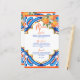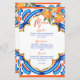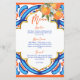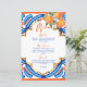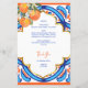 She found her Main Squeeze bridal shower blue orange menu card template, blue Majjolica Spanish Mediterranean tiles bunch of oranges with modern casual script, nice for summer outdoor functions personalised menu cards.