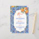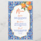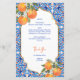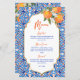 She found her Main Squeeze bridal shower blue orange menu card template, blue Majjolica Spanish Mediterranean tiles bunch of oranges with modern casual script, nice for summer outdoor functions personalised menu cards.