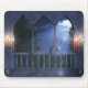Standing on a candlelit balcony at night, looking out on red roses and a willow tree growing on the grassy bank of a lake. The bright rays of the silver moon stream through the window arches.