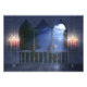Standing on a candlelit balcony at night, looking out on red roses and a willow tree growing on the grassy bank of a lake. The bright rays of the silver moon stream through the window arches.