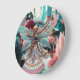 A beautifully intricate fairy with colourful, patterned wings stands in a whimsical, otherworldly landscape filled with fantastical plants and futuristic structures. Vibrant and ethereal, the scene exudes a dreamlike quality with its pastel hues and imaginative setting.