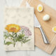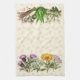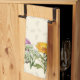 Beautiful herbs kitchen dish towel. Medicinal herbs make a wide border on each end of off-white towels. Little dragonflies flutter in the background. Herbs featured include white yarrow flowers, yellow calendula, purple burdock, aloe, feverfew and more. The design is printed on one side only. Either way this towel hangs, a pretty floral design will show. Perfect for an herbalist's kitchen, or naturalist.