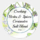 A sticker for an herbal blend that you can customise for the specific herbs in the recipe decorated with hand drawn coriander herbs around the border drawn with ink and coloured pencil.