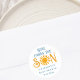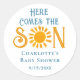 This cute sunshine-themed baby shower sticker features a watercolor yellow sun and "Here comes the Son" in stylish retro blue typography. Perfect for a boy's baby shower.