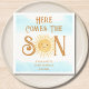 These cute boy's baby shower paper napkins feature the text "Here Comes The Son" in stylish brown typography with a cute yellow watercolor sun and blue sky.