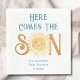 These baby shower paper napkins feature the text "Here Comes The Son" in stylish blue typography with a cute yellow watercolor sun.