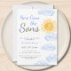 Invite family and friends to your sun-themed twin boys' baby shower with this cute invitation. It features the text "Here Come The Sons" in stylish blue typography with a yellow watercolor sun and clouds. Easily customisable. Original Watercolor © Michele Davies.