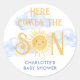This cute boy's baby shower sticker features the text "Here Comes The Son" in yellow typography with a smiling watercolor sun. Easily customizable. Original Watercolor © Michele Davies.