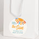 This sun-themed baby shower sticker is decorated with a colourful sun and stylish typography on a cream background. The text is customisable. Original Watercolor © Michele Davies.