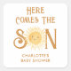 This cute boy's baby shower sticker features the text "Here Comes The Son" in retro typography with a smiling yellow watercolor sun. Easily customisable. Original Watercolor © Michele Davies.