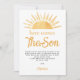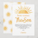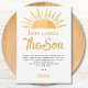 This sun-themed boy's baby shower thank you card features the text "Here Comes The Son" in stylish typography with a yellow watercolor sun. Easily customisable. The back is decorated with a sun pattern. Original Watercolor © Michele Davies.