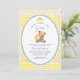 Here Comes the Son Bear Baby Shower Invitation | Sunshine Boy Shower Gingham - Celebrate the arrival of your little ray of sunshine with this sweet Here Comes the Son Bear Baby Shower Invitation. The design features an adorable baby bear hugging a smiling sunshine, surrounded by a soft blue scalloped frame and cheerful yellow gingham background.