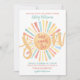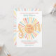 Celebrate the upcoming arrival with this bright and cheerful retro vibe sun-themed baby shower invitation, perfect for a baby boy. The design features a big sun with vibrant rays in yellow, orange, red, teal, and blue at the centre, setting the tone for a joyful celebration. The phrase "Here Comes the Son" is displayed as part of the sun design, with "Son" in big script letters placed over the sun, cleverly using the centre of the sun for the "o" in "Son." At the bottom, all the event details are styled in a combination of font styles and colours—red and teal blue—that complement the sun's rays. The back of the invitation showcases a larger version of the colourful sun. This design is ideal for celebrating the mother-to-be and welcoming a new little ray of sunshine into the world with a touch of boho, retro, and modern flair. Cute Colourful Sun Theme Here Comes The Son Boy Baby Shower Invitation Yellow Orange Red Teal Blue.