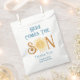 This cute boy's baby shower favour bag features the text "Here Comes The Son" in blue retro typography with a smiling yellow watercolor sun. Easily customisable. Original Watercolor © Michele Davies.