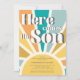 This cheerful sun-themed boy's baby shower invitation features "Here Comes The Son" in retro typography on a colourful sunburst background.