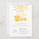 Make your boy baby shower unforgettable with this retro sunshine theme invitation. The design features a watercolor illustration of a yellow sunshine, on a simple white background making it both fun and charming, while the phrase "here comes the son" adds a playful element to the card. Use the design tools to customise the text, fonts and colours! Also available as digital download for evites.