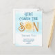 This cute boy's baby shower thank you postcard features the text "Here Comes The Son" in blue retro typography with a smiling yellow watercolor sun, clouds, and sky. Easily customisable. Because we create our artwork you won't find this exact image from other designers. Original Watercolor © Michele Davies.