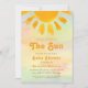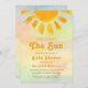 This gender-neutral baby shower invitation is decorated with a watercolor sun and "Here Comes The Sun" in stylish retro typography on a colourful background.