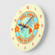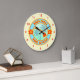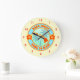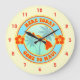 Maui Hawaii clock. "Here Today - Gone to Maui", a play on words of "here today, gone tomorrow". In the tropical colours of orange, yellow and light blue. Featuring the design elements of hibiscus flowers, palm trees and the Hawaiian Island chain. Maui Hawaii wall clock.