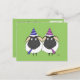 Post Card showing two adorable sheep in party hats with horns. Caption on the back of the postcard reads, "Here's Two Ewe Congratulations!". Background is displayed as a green colour, but it and the font and phrase can easily be customised to whatever you'd like.