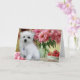 This cute Birthday Card features Hermes, a cute little Maltese Puppy. He is sitting on a table beside a vase of beautiful Peony Roses.